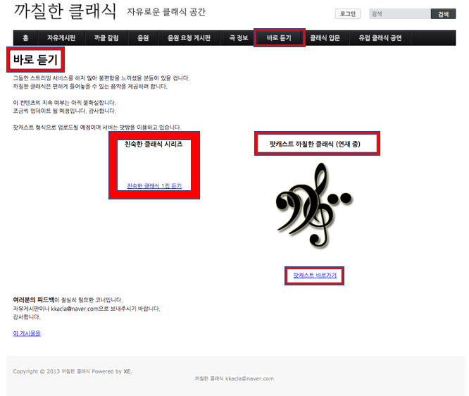 클래식 음악 연속 듣기를 하고픈 분들은 상단 메뉴에서 '바로 듣기'를 선택해 홈페이지를 떠나지 않고 친숙한 클래식 1집 듣기 그리고 까칠한 클래식 팟캐스트 중 원하는 채널을 선택해여 계속해서 감상을 할 수 있는 부분 또한 존재합니다.