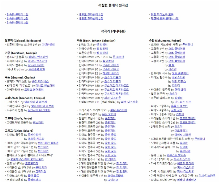 음원 페이지에서 까칠한 클래식 선곡집과 같이 작곡가별로 또한 곡이 정리가 되어있고, 그 곡들간에 연주자에 따라 분류가 되어있어서 목록을 잘 살펴보면, 원하는 클래식 음악을 선택해 다운로드 혹은 연속 듣기 등을 해주시면 되겠습니다.
