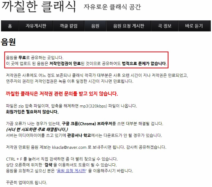 클래식 음악 연속 듣기 원하는 분들은 위 이미지에 보이는 것 처럼 다운 받아 자신만의 재생목록을 만들어 음악 연속 듣기를 할 수 있으며, 상단에 있는 '음원'을 클릭한다면, 작곡가 그리고 작곡가의 곡과 연주자 등을 선택해 원하는 클래식 음악을 다운 받을 수 있다고합니다. 음원 페이지 상단에는 저작권 관련 안내 또한 나타나있는데, 까칠한 클래식에서 제공하는 음원들은 저작권에 대한 효력이 만료되어진 음악만 모아놓은 곳이고, 법적으로 문제가 없는 음악 뿐이라 회원가입이 없이도 다운을 받을 수 있다는 소식도 전합니다.