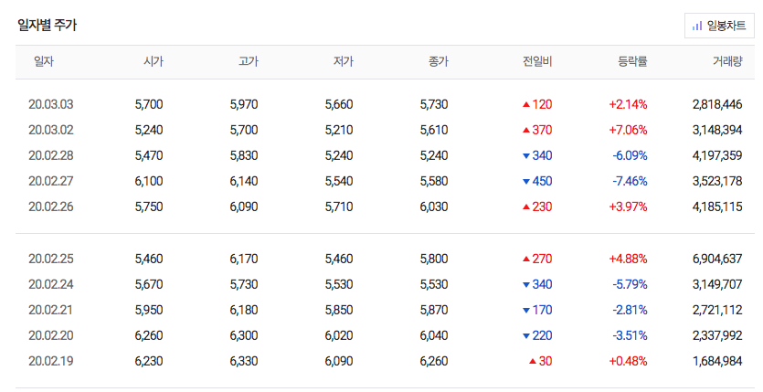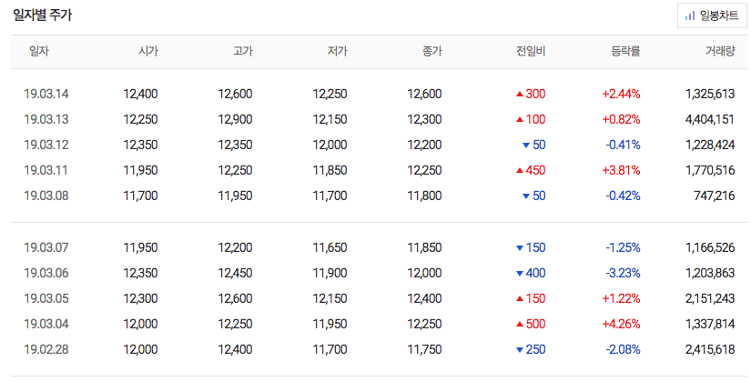 2019년 일자별 주가 기록표를 보자면, 전년 동월 동일로 대략 비교를 해볼 수 있는데, 당시 매도세가 조금 더 강하다는 것을 알 수 있었으며, 해당 기간에는 별다른 이슈는 없었던걸로 기록되어있습니다. 최고가는 12,900으로 상승하여 기록을 하였고 그 후로는 지속적인 하락세를 보였답니다. 아마도 지금도 마찬가지로 하락세를 유지하다가 3개월이 되는 시점부터 비슷한 시기에 다시금 더 큰 상승세를 이어가지 않나라는 생각을 해봅니다.