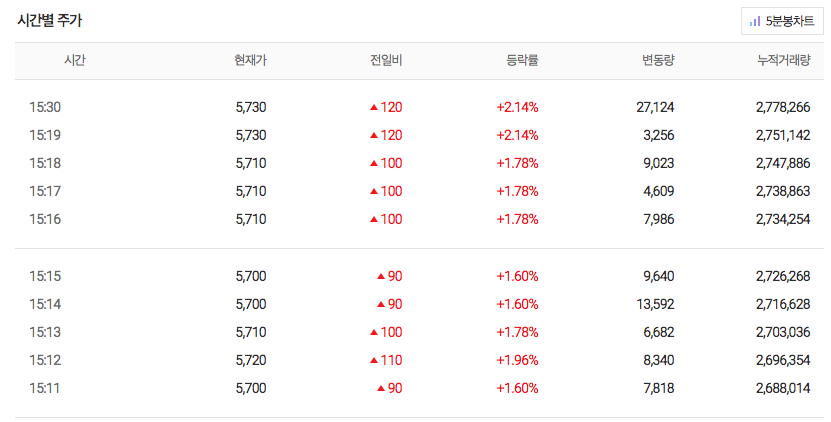 시간별 주가를 확인하면 알 수 있다시피 15시 11분 부터 15시 30분까지의 주가변동인데, 전일비 평균 100정도를 유지하는 모습을 보였으며, 등락률 또한 +1.78로 평균적인 추세가 해당 시간에 많이 보여주었다고 볼 수 있겠습니다.