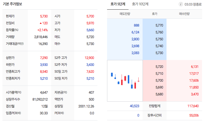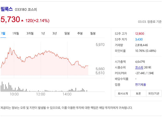 최근들어 필룩스 주가는 상승곡선을 나타내고있는데, 기대주로 자리를 잡고있다고 합니다. 지금으로써는 현재가 5,730의 수치를 기록하며, 전일대비 120(+2.14%)로 상승세를 나타내고있으며, 최근에는 거래가 활발해지고 있는 것으로보아 집중적으로 많은 투자자들로부터 투자가 진행되고 있는 것으로 보입니다.