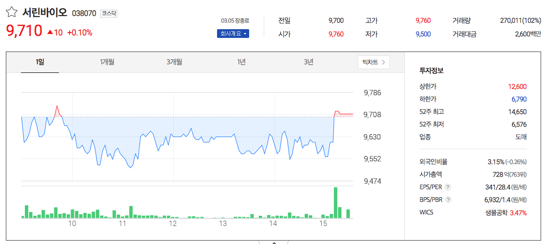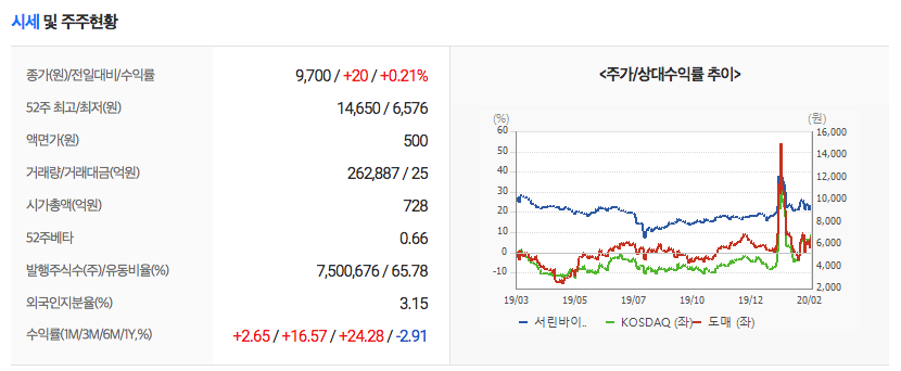 서린바이오 주가 차트를 살펴보자면 2015년 7월에는 최고가로 21,565원을 기록했으며, 이후 급격하게 떨어지는 하향세를 지나 8월말에는 52주로 최저라인 6,576원을 기록하였고, 이후로는 횡보를 하고 있습니다. 마스크 관련주로 분류가 되어 큰 상승세를 띄기도 하고있지만, 해당 테마의 재료가 소멸되며 또다시 주가는 하락하고 원래 주가를 찾아가고있는 추세로 보면 되겠습니다. 이후로 관심이 있는 이슈로는 이재명 관련주로써 어떠한 움직임이 있을지 기대가 되는 종목입니다.