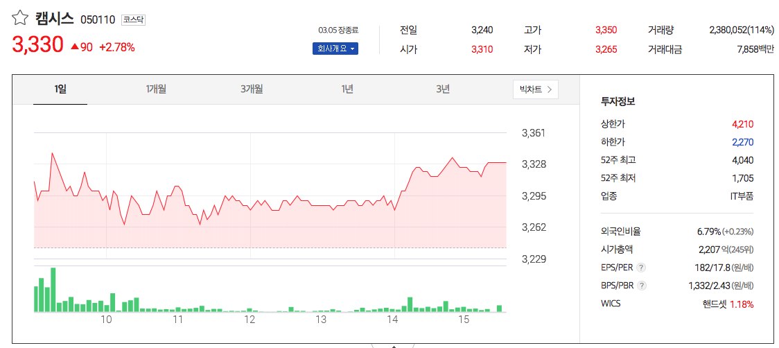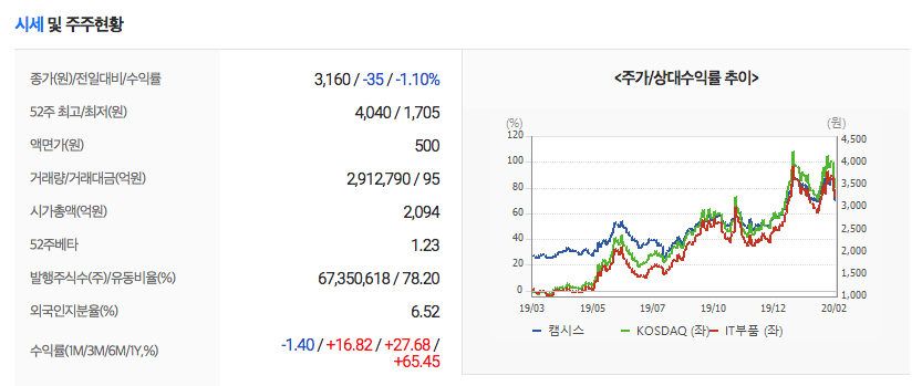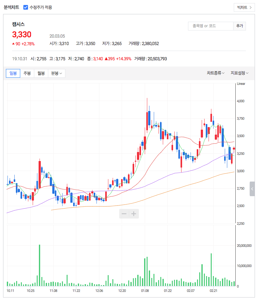 앞서 언급한 바와 같이 캡시스의 대표이사로 박영태는 이재명 도지사와 중앙대학교 동문으로써 이재명 관련주로 분류가 되어 움직임을 종종보이고 있습니다. 캠시스는 몇 년째 2,000원을 앞 뒤로 하여 1,000원에서 3,000원 정도의 가격안에 이동을 보이고있으며, 횡보를 하고있는 종목입니다. 종종 급등을 하는 경우가 있어보이는데, 총선 시즌에 움직임은 큰 상승을 기대해 볼 수 있는 종목으로 보입니다.