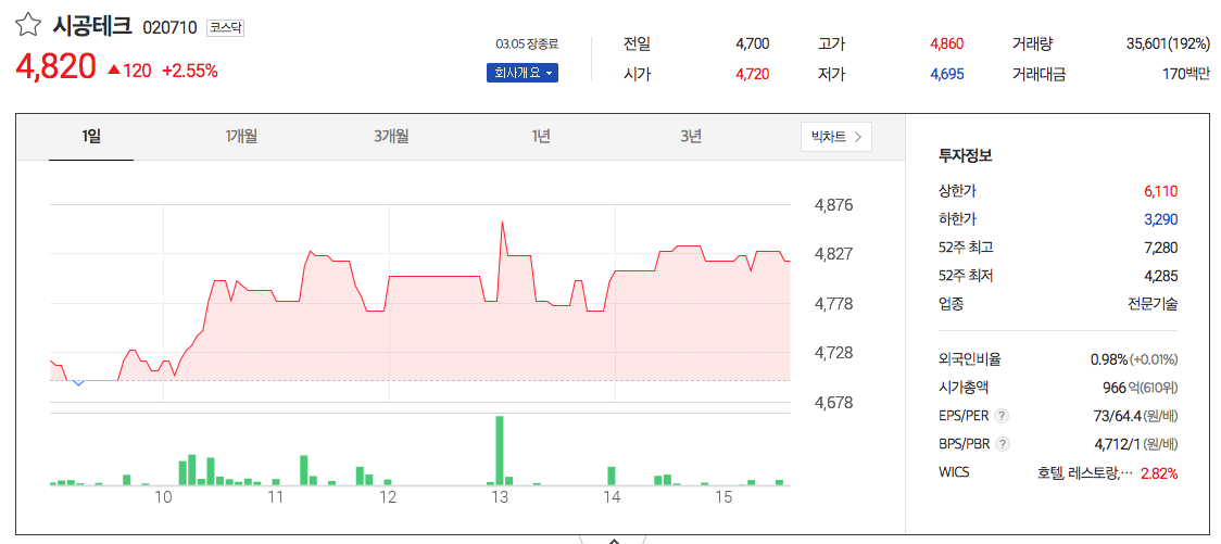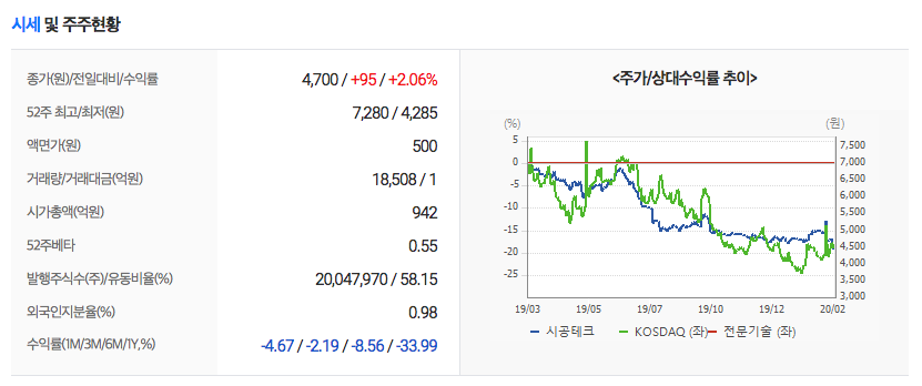 시공테크의 자회사로써 시공미디어의 부회장 곽덕훈은 성나망조경영 CEO 포럼의 SW 운영위원으로 있기에 이재명 관련주로 보여지고 있습니다. 차트를 보자면, 2018년 초에는 큰 폭으로 급등하였고 10,200원을 기록 그리고 이후 2년 가까이 하락세를 띄면서 주가가 계속해서 많이 떨어져있는 상태를 확인할 수 있었습니다. 이번 총선을 앞두고 시공테크 주가 정망은 어떻게 될지 궁금하네요.