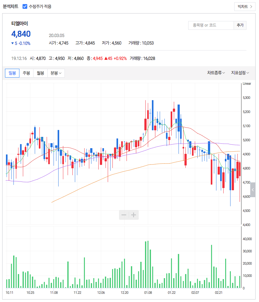 이 티엘아이 종목으로는 김달수 대표가 자문위원장으로 있기에 이재명 관련주에 대한 움직임을 보여주고있습니다. 차트를 보다보면, 2010년에는 주가가 하락하였고 2012년부터는 앞으로 10년동안 엄청난 큰 추세의 상승은 없었고 5,000원 전후로 주가를 지키면서 오랜기간을 횡보하고 있습니다. 2019년 3월에는 3,535원의 저점을 기록했고 조금의 상승으로 다시 중장기 이동평균선 위로 상승하여 5,000원 대를 계속해서 기록하고 있는 중입니다.
